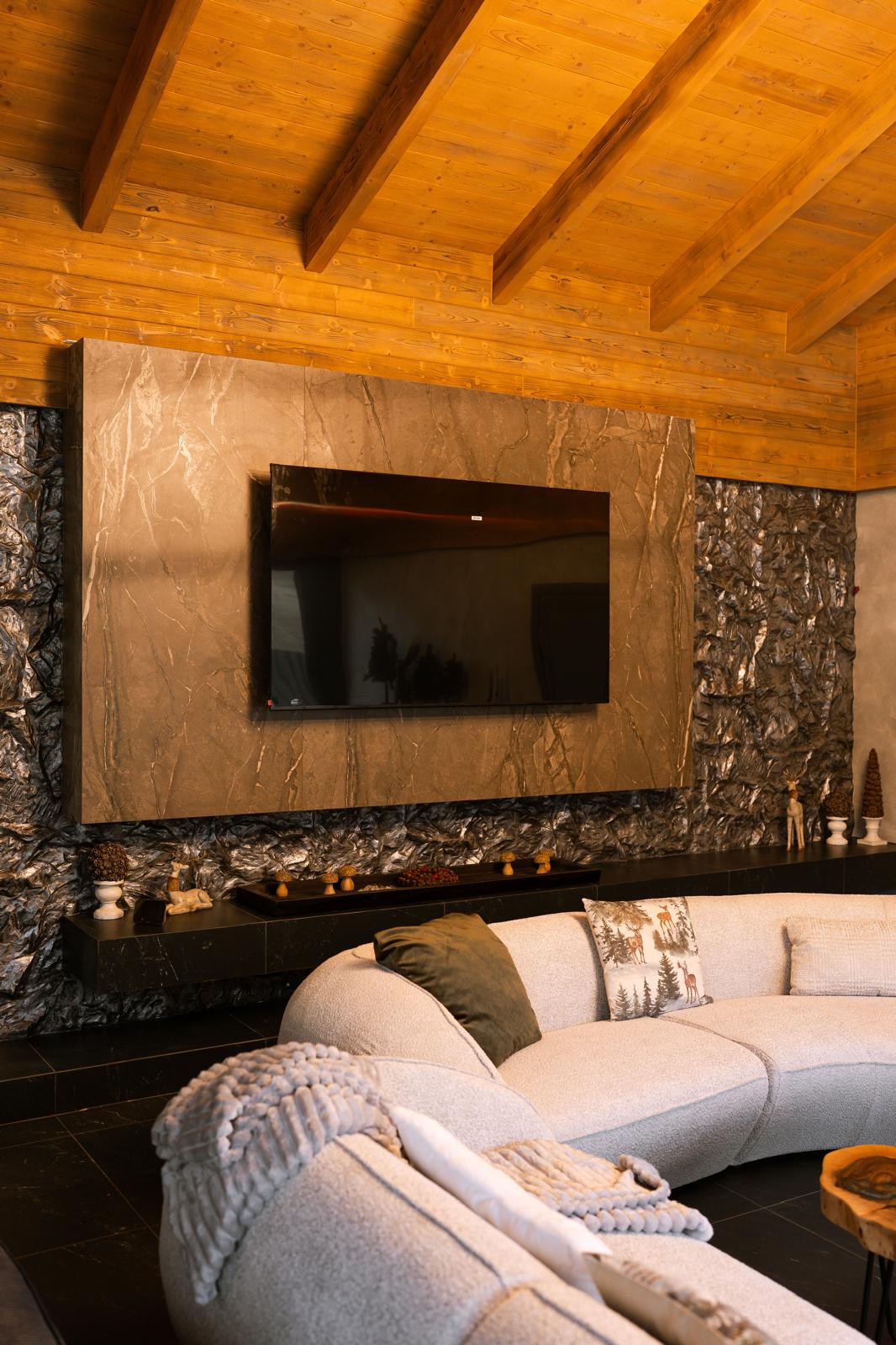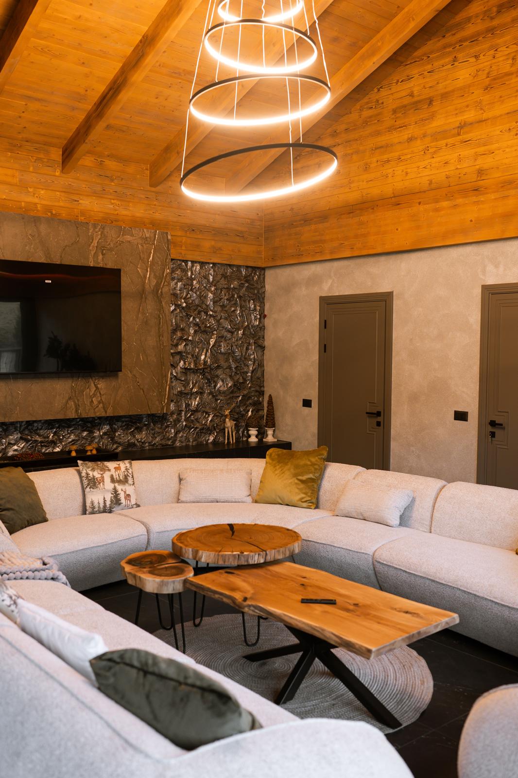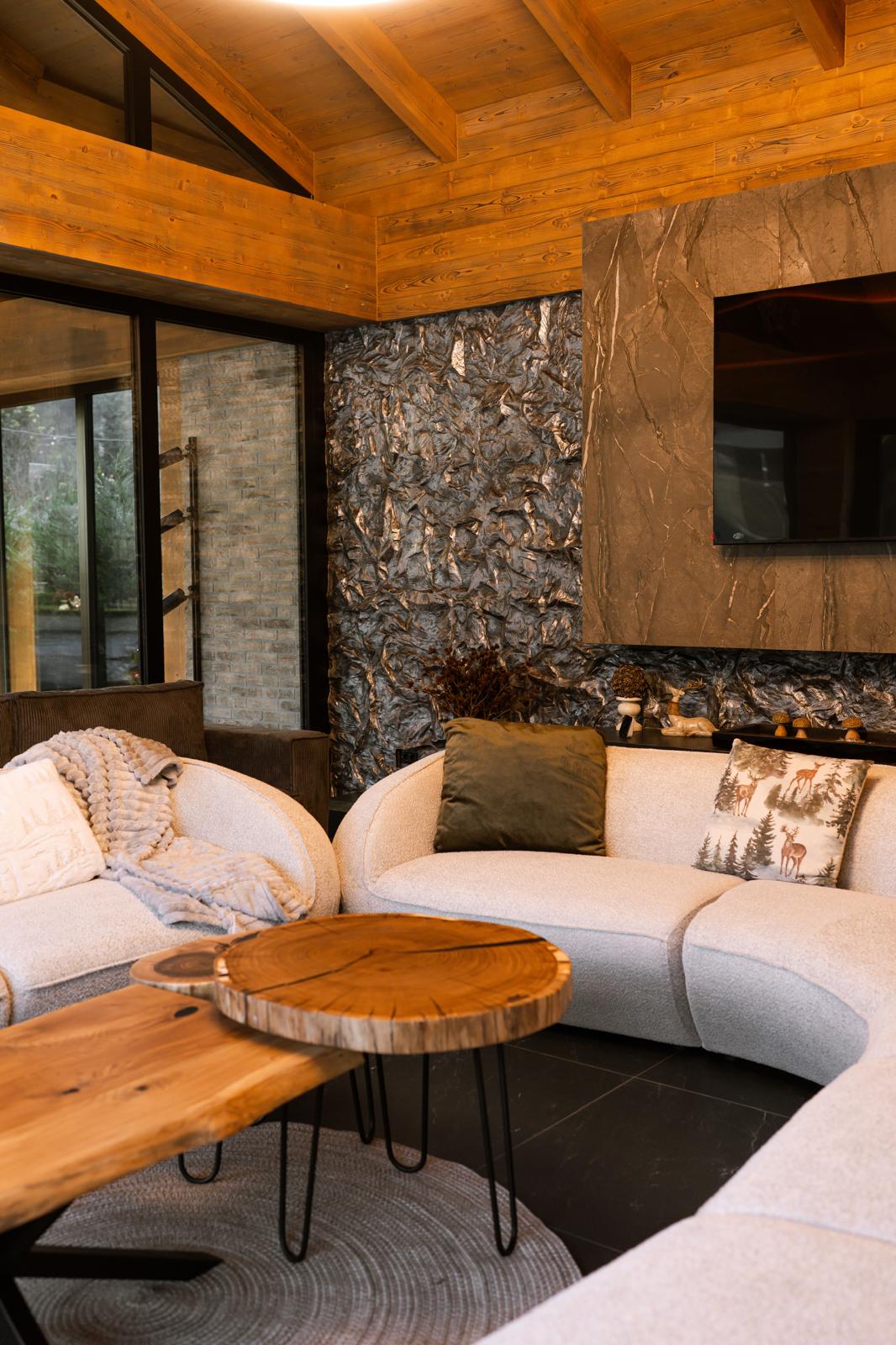 O zonă elegantă de relaxare cu canapele confortabile, sistem audio premium și Smart TV. Locul perfect pentru socializare sau relaxare după saună.